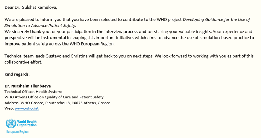 Gulshat Kemelova, head of the Center for Simulation and Educational Technologies, has been included to the international research team of the World Health Organization (WHO) Regional Office for Europe for the project "Developing Guidance for the Use of Simulation to Advance Patient Safety". All participants of the research team qualified extensively, including interviews and a comprehensive analysis of professional and personal details of candidates. The research team includes leading experts from the United Kingdom, Portugal, and Norway.This project focused on developing international recommendations for integrating simulation methods into healthcare and medical education systems to strengthen the culture of patient safety.