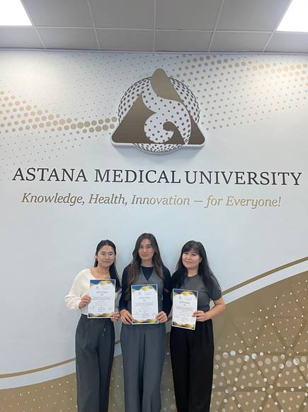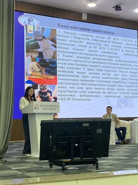 All three master's degree students were highly evaluated by the judges of the contest and received top places: Nargiz Kaiyrzhanova with a report on the topic of «Восстановление речи у пациентов с постинсультной дизартрией методом ПНФ оромандибулярной зоны» (“Speech restoration in patients with post-stroke dysarthria using the PNF method of the oromandibular zone”) took second place and was awarded a second-degree diploma; Botagoz Bataa with a report on «Проприоцептивті нейробұлшықеттік фасилитацияның жедел кезеңдегі инсульттан кейінгі қол парезін қалпына келтіруге әсері»