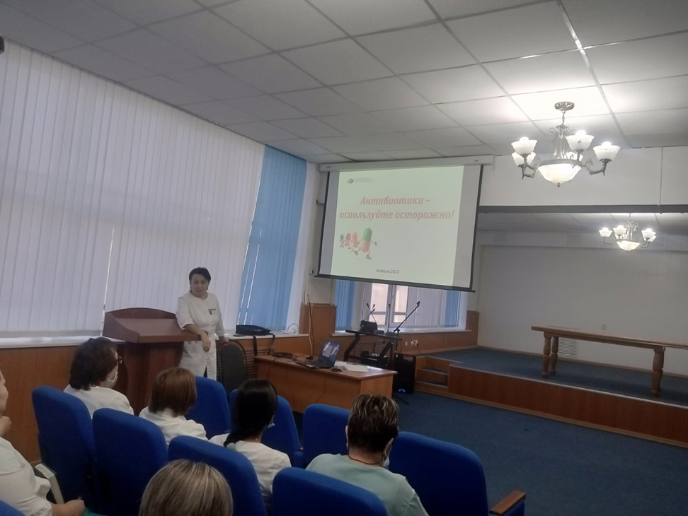 Ассистент-профессор Сагадатова Т.К. Облыстық балалар клиникалық ауруханасының қызметкерлерімен семинар өткізіп, онда да антибактериалды препараттарды ұтымды қолдану, клиникалық хаттамаларды сақтау және инфекциялық бақылау сапасын арттырудың қажеттілігі талқыланды.