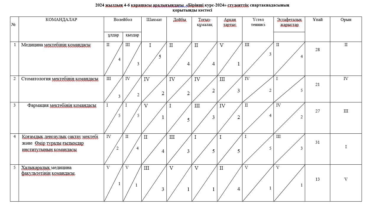 «Бірінші курс-2024» спартакиадасы аяқталды. Үш күннің қорытындысы бойынша орындар төмендегідей бөлінді.