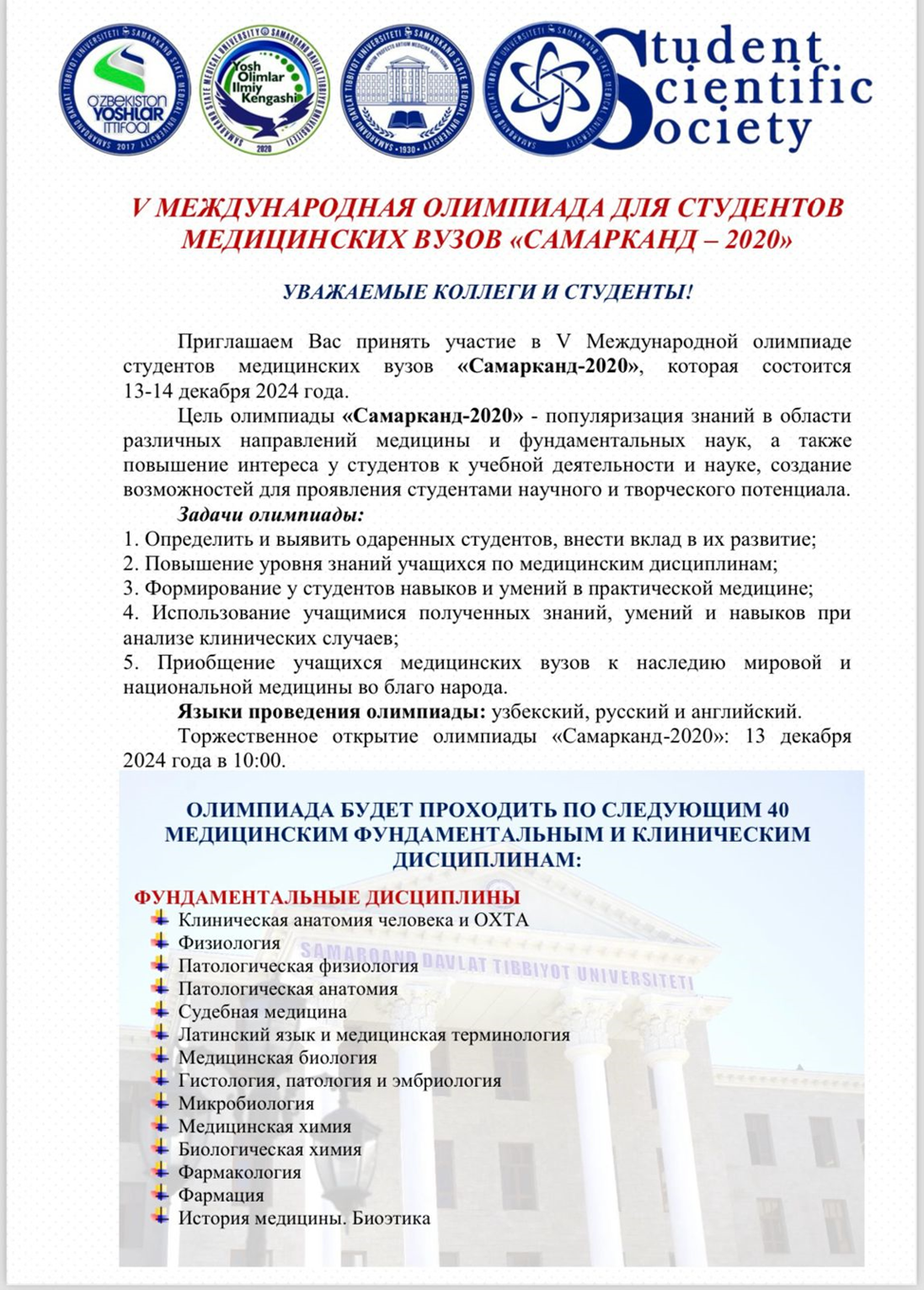2024 жылдың 13–14 желтоқсаны аралығында «Самарканд – 2020» медицина университеттер студенттері арасындағы V –Халықаралық олимпиада өтті. Олимпиада жетекші медициналық оқу орындары өкілдерінің алаңы болды. Олимпиада онлайн және офлайн форматта өтті. Олимпиядағы студенттік ғылыми үйірмедегі 6-7 курс интерндері қатысты. Ғылыми жетекшілері «Отбасылық медицина» кафедрасының ассисстент-профессоры Батырбекова Лазат Сарсенбаевна.