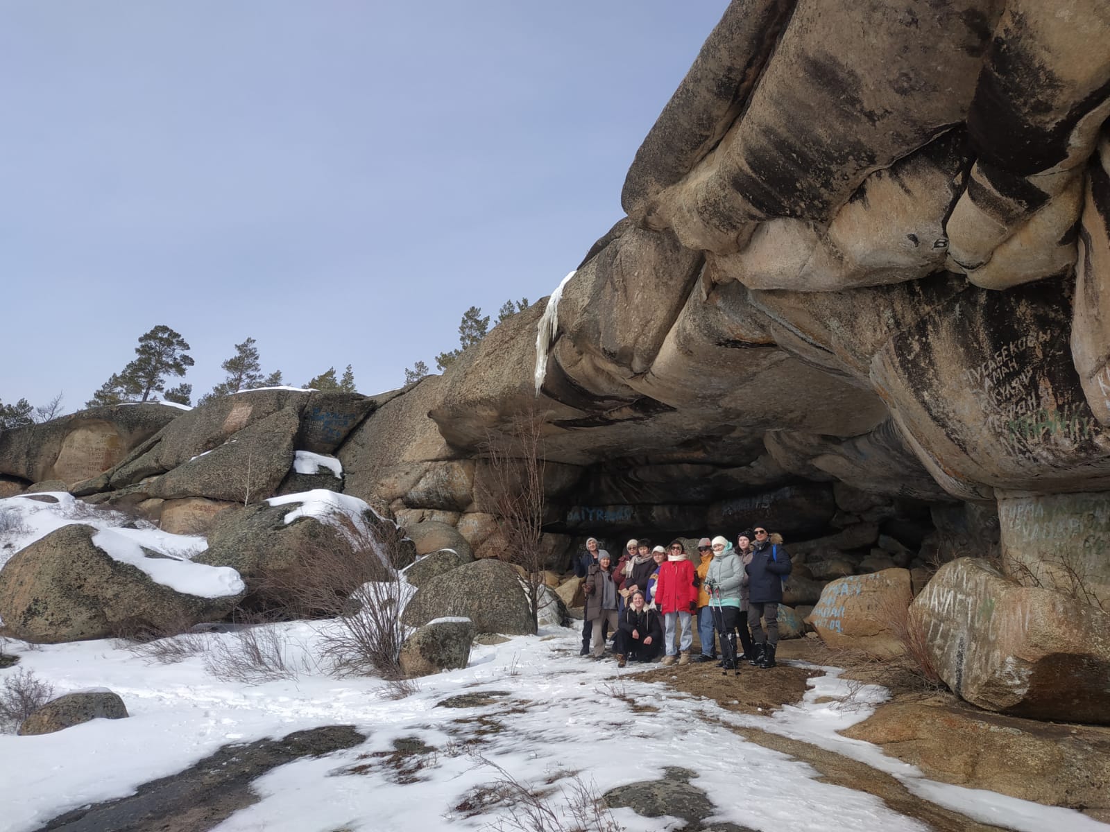 Во время поездки мы совершали небольшие походы по живописным окрестностям Каркаралинска: поднимались на смотровую площадку, с которой открывается вид на город и окружающие его горы, посетили местную достопримечательность – пещеру «Большая палатка», на стенах которой имеются надписи и автографы жителей Каркаралинска, начиная с 1903 года! Увидели в глубине пещеры памятный камень, установленный в честь народного композитора Мади Бапиулы, погибшего в годы Гражданской войны «красных» и «белых». Во время экскурсий участникам были сообщены сведения по истории Каркаралинска, который был основан в 1824 году. На второй день нашего пребывания мы совершили лыжный поход по Сосновому бору, общей протяжённостью около 10 км, в ходе которого самые стойкие и выносливые из нас, во главе с постоянным членом кружка и участником многих поездок и экскурсий – ассистентом профессором Е.А. Котовым (кафедра Морфологии), уже без лыж, поднялись на знаменитое озеро Шайтанколь; за много лет поездок и экскурсий в Каркаралинск это восхождение впервые произошло зимой!