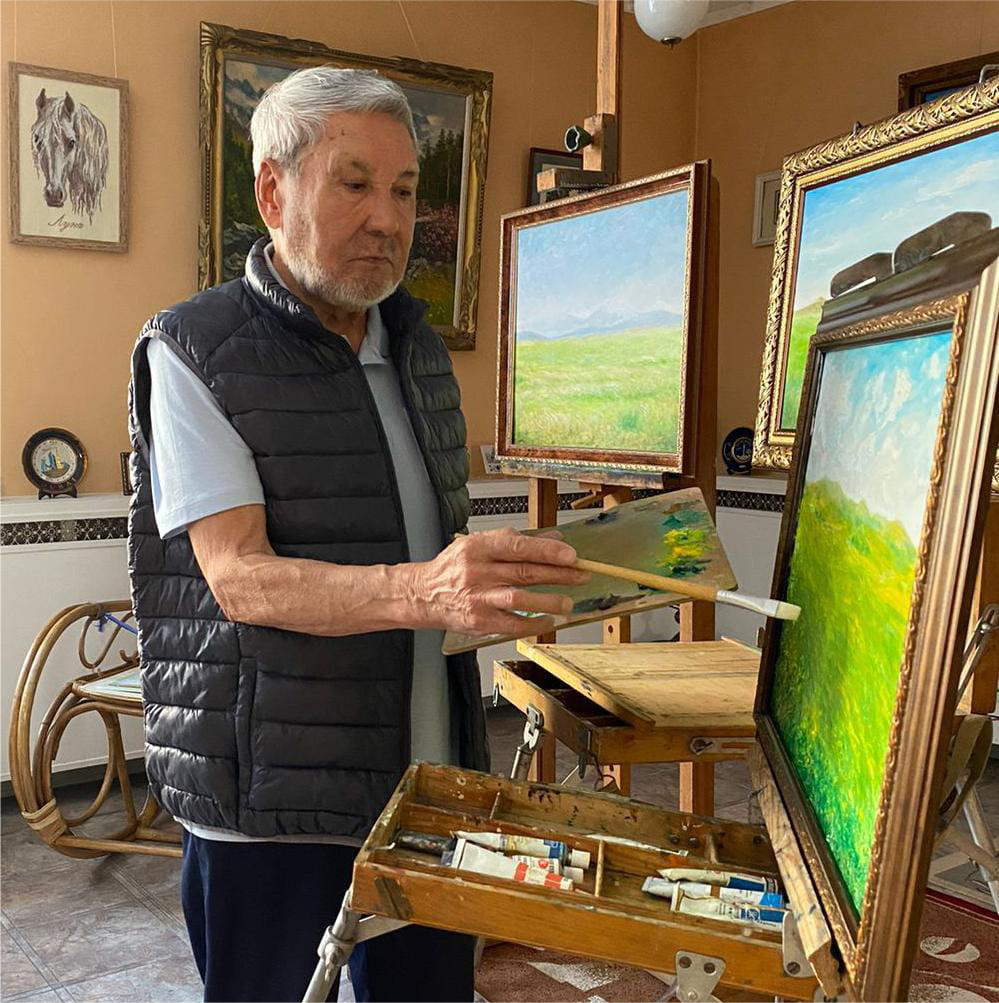 Его полотна — это не просто картины, это философия казахской степи, запечатлённая в цвете и свете. Они с успехом экспонировались в Италии, Франции и России, покоряя зрителя глубиной мысли и духовным звучанием.