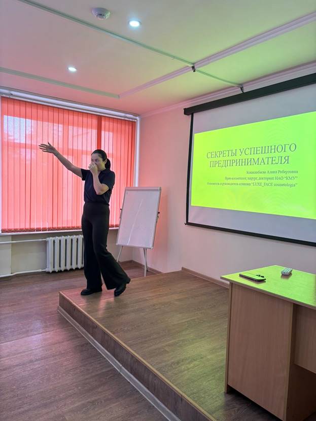 В Послании Главы государства Касым-Жомарта Токаева народу Казахстана «Казахстан в эпоху искусственного интеллекта: актуальные задачи и их решения через цифровую трансформацию» от 8 сентября 2025 года, Президент РК отмечает, что движущей силой цифрового развития страны должны стать предприниматели.В рамках данного Послания на кафедре истории Казахстана и социально-политических дисциплин студенты первого курса ОП «Медико-профилактическое дело», изучающие модуль «Основы предпринимательства и антикоррупционной культуры», приняли участие в увлекательном семинаре «Предприниматели — цифровой импульс развития: финансовая грамотность как драйвер успеха» с участием выпускницы Карагандинского едицинского университета, докторанта, предпринимателя города Караганды – Кошкинбаевой Алины Робертовны, (врач-косметолог, хирург, основатель и руководитель клиники). Алина Робертовна поделилась богатым опытом управления собственным бизнесом, а также рассказала о непростых моментах и распространенных ошибках начинающих бизнесменов.