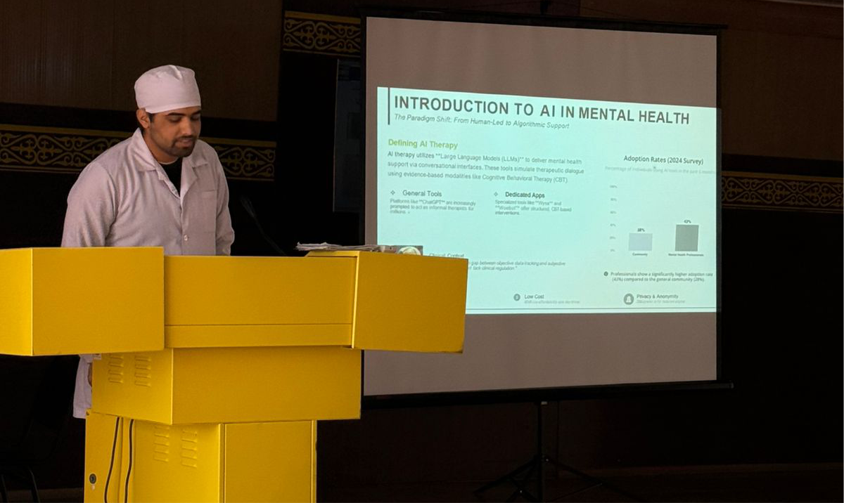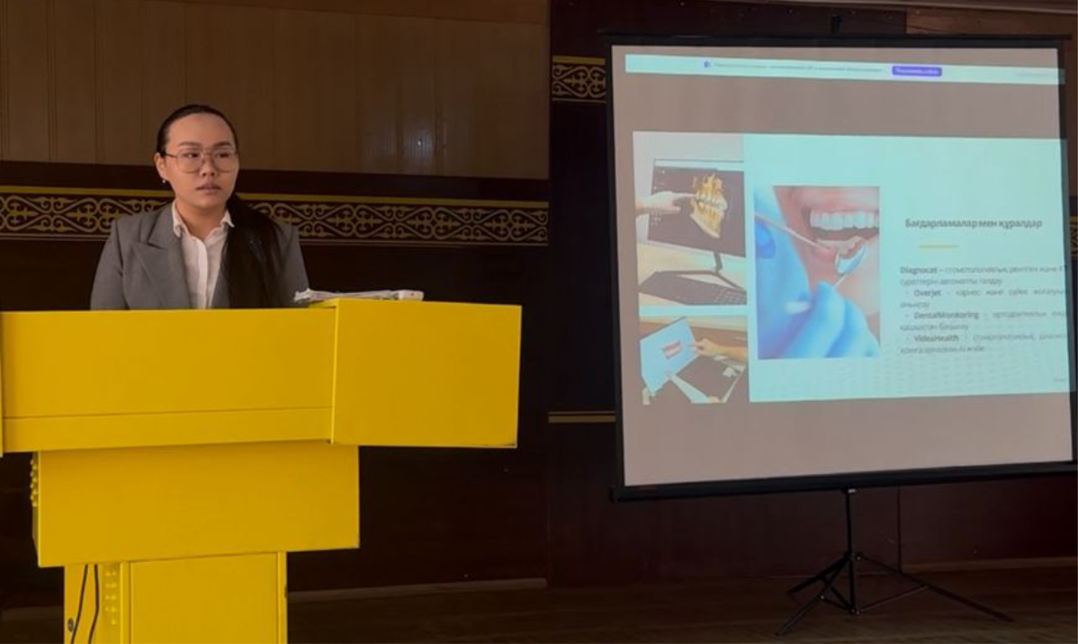Среди выступающих: студенты 4 курса специальности «Стоматология» Миратова Д. с докладом «Использование искусственного интеллекта в психическом здоровье и его этические последствия»; Токжанова А. с докладом «Искусственный интеллект в стоматологии: возможности и проблемы».