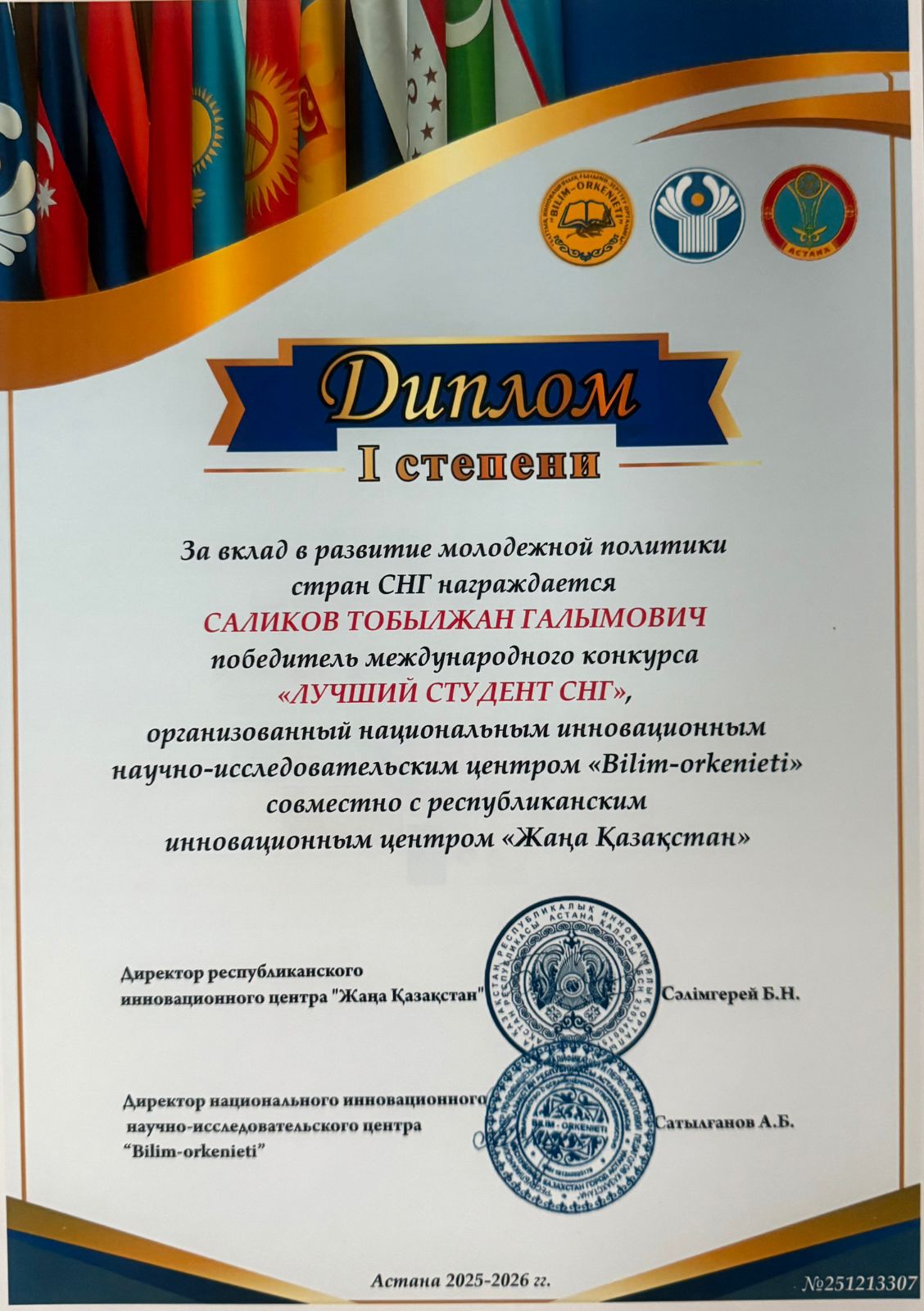 13 декабря 2025 года в г. Астана в рамках празднования Дня Независимости Республики Казахстан, состоялось награждение международного конкурса «Лучший студент СНГ 2025–2026». В конкурсе приняли участие студенты из стран СНГ, ближнего и дальнего зарубежья: Казахстан, Узбекистан, Кыргызстан, Таджикистан, Туркменистан, Россия, Индия.Дипломом I степени и почётным званием «Лучший студент СНГ» награждён