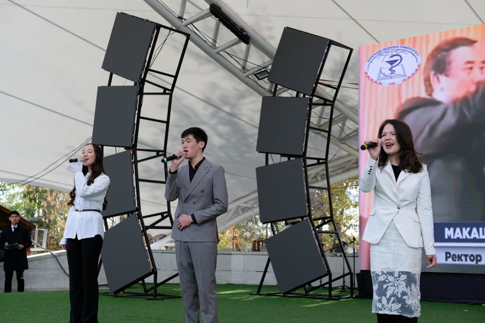 Церемония началась с исполнения гимна КМУ, который создал атмосферу праздника и вдохновения. С приветственными словами и тёплыми пожеланиями к первокурсникам обратились Председатель Правления – Ректор университета, доктор медицинских наук, профессор Бахыт Нургалиевна Кошерова и проректор по академической работе Куатбек Куанышбекович Толеубеков, пожелав студентам успехов в учёбе и научной деятельности.