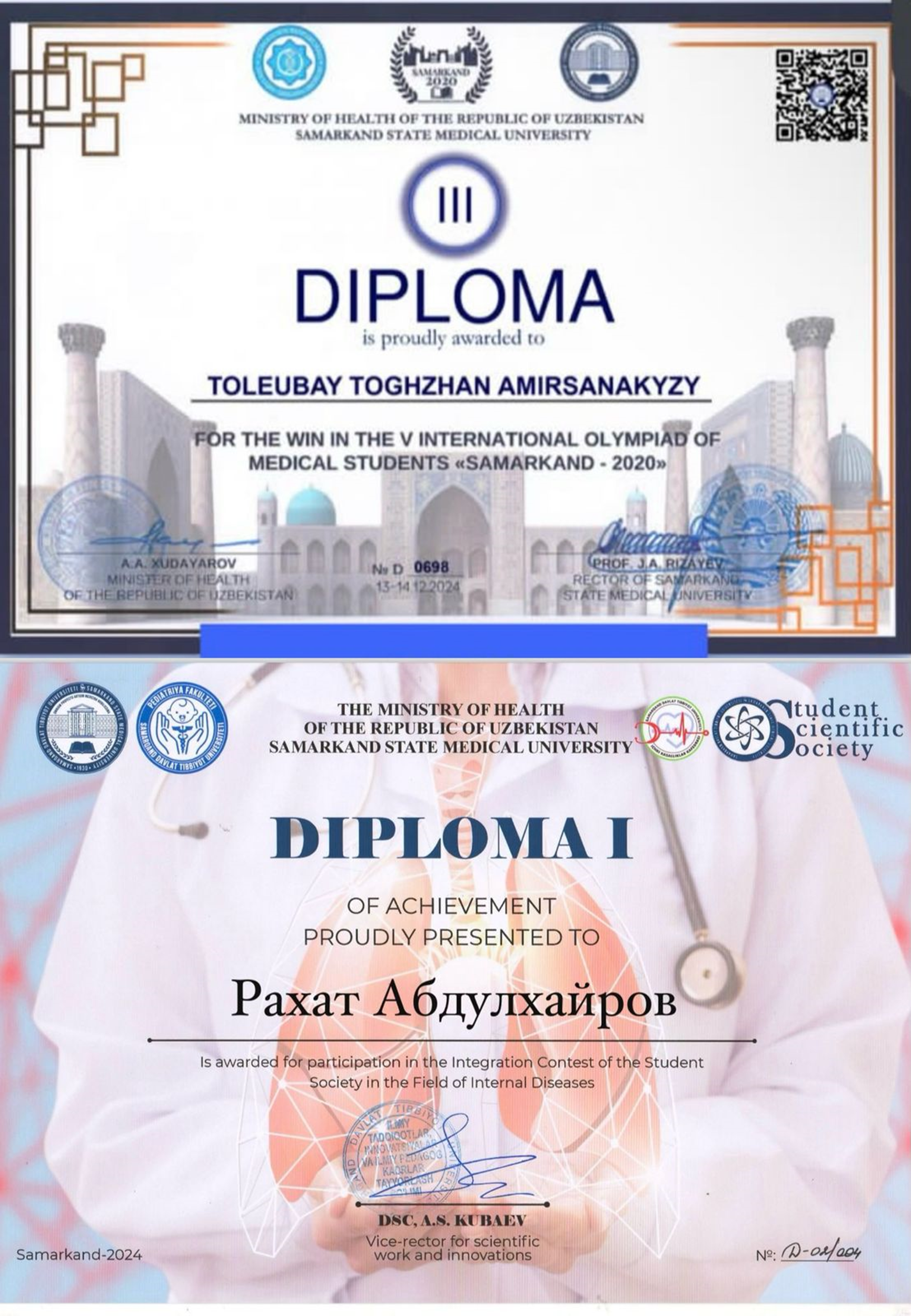 13–14 декабря 2024 года состоялась V Международная олимпиада для студентов медицинских вузов «Самарканд – 2020», объединившая представителей ведущих медицинских образовательных учреждений. Олимпияда прошла в онлайн также офлайн формате. Наши интерны продемонстрировали высокий уровень знания и профессиональную компетентность. Интерны 6029 группы Абдулхайров Рахат по итогам участия в конференции был награждён дипломом II место, интерн Толеубай Тогжан — дипломом III место. Поздравляем участников с заслуженными наградами и выражаем благодарность за активное участие, стремление к развитию научного и клинического потенциала. Научный руководитель - ассисстент-профессор кафедры семейной медицины Батырбекова Лазат Сарсенбаевна.