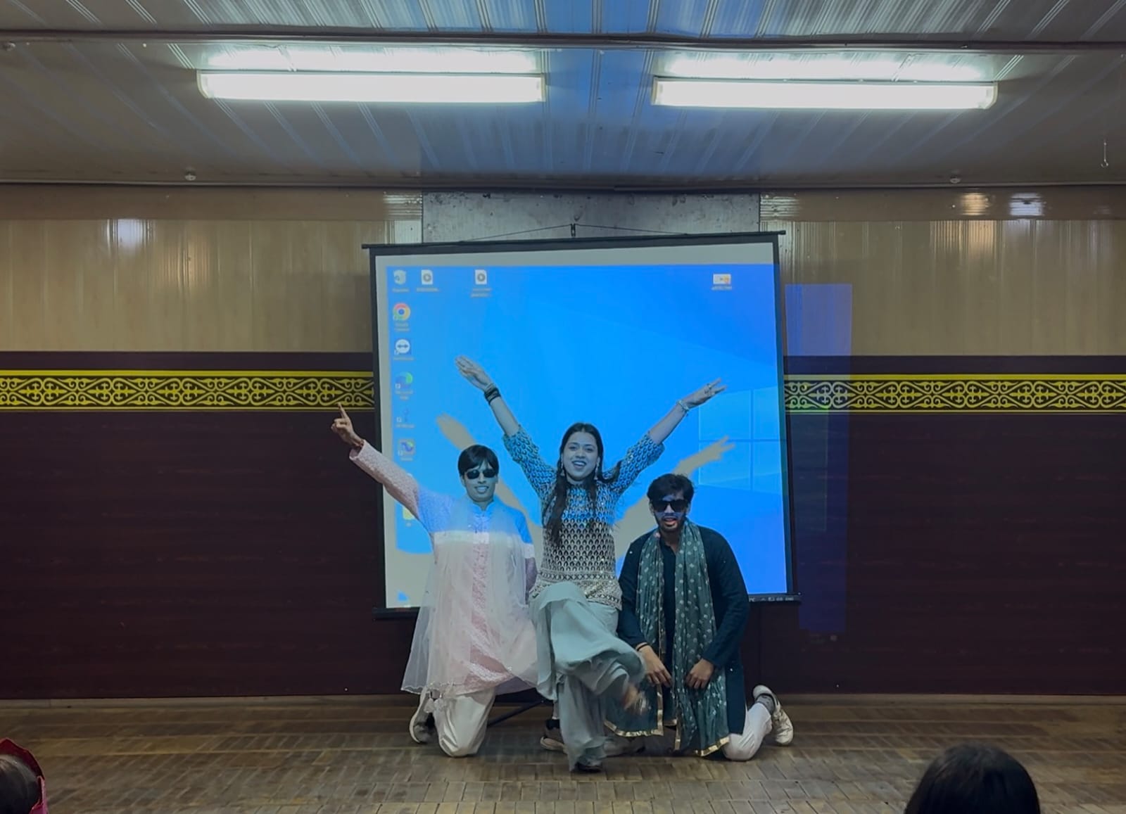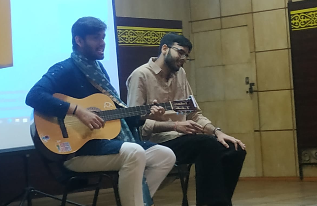 Наконец, на сцену вышли студенты ММФ 3 курса - Санадхия Мадхав и Иншант, а также студентка 2 курса Санчора Ваншика, студент 4 курса Виас Хардик. Мы услышали песни на хинди под гитару в исполнении Махдава и Хардика; нежная и мелодичная песня лилась со сцены поточной аудитории к нам – в зал, наполняя нас колоритом богатого музыкального наследия тысячелетней истории Индии и её народа! Песни сопровождались танцами в исполнении настоящих танцоров - студента Ишанта и необычайно выразительной и пластичной в танце студентки Ваншикой! Мы точно побывали в атмосфере столь любимых многими поколениями стран СНГ – индийских фильмов 70 – 80-х годов прошлого века! Так, Ишант на сцене мастерски, как настоящий артист, изображал мимикой и жестами содержание песен, делая их сюжет нам – зрителям понятным без слов и переводов! По окончании выступления зрители, большинство из которых, в этот раз были студенты ММФ, долго аплодировали, не желая отпускать талантливых исполнителей со сцены.